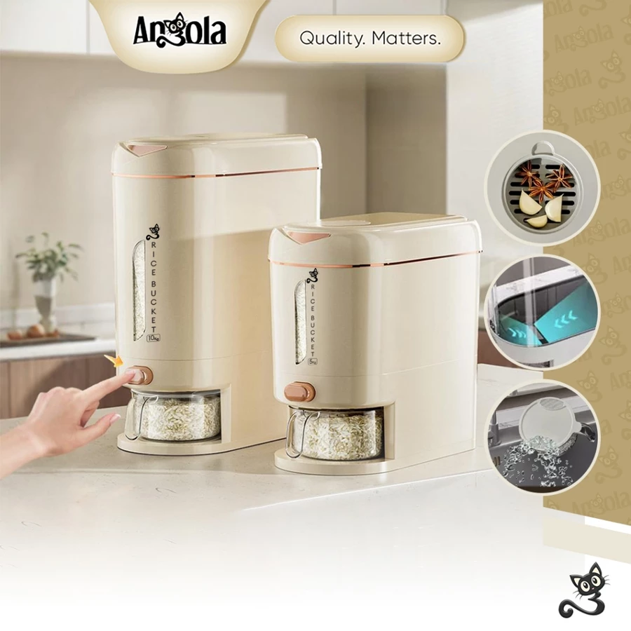 ANGOLA Dispenser Beras Otomatis — solusi cerdas, higienis, dan efisien untuk penyimpanan beras di rumah Anda.