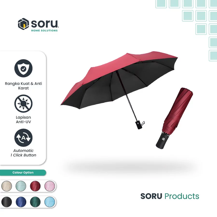 SORU Payung Lipat Otomatis menghadirkan keseimbangan antara kekuatan, kenyamanan, dan gaya. Cocok bagi kamu yang menginginkan payung praktis dengan kualitas premium untuk melindungi dari hujan dan terik matahari.