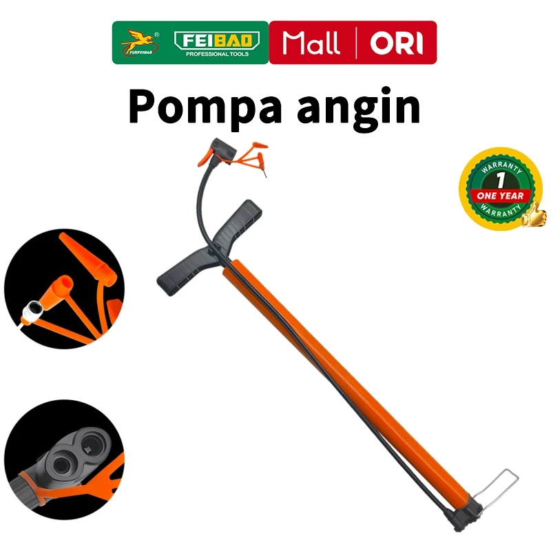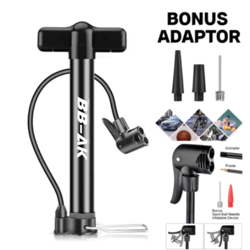Pompa angin terbuat dari bahan besi (iron) yang kokoh dengan desain ergonomis sehingga nyaman digunakan, hemat tenaga, dan mudah disimpan. Dengan tambahan adaptor French & American valve (universal adapter), pompa ini bisa digunakan untuk berbagai kebutuhan, mulai dari ban sepeda, motor, mobil, hingga bola.