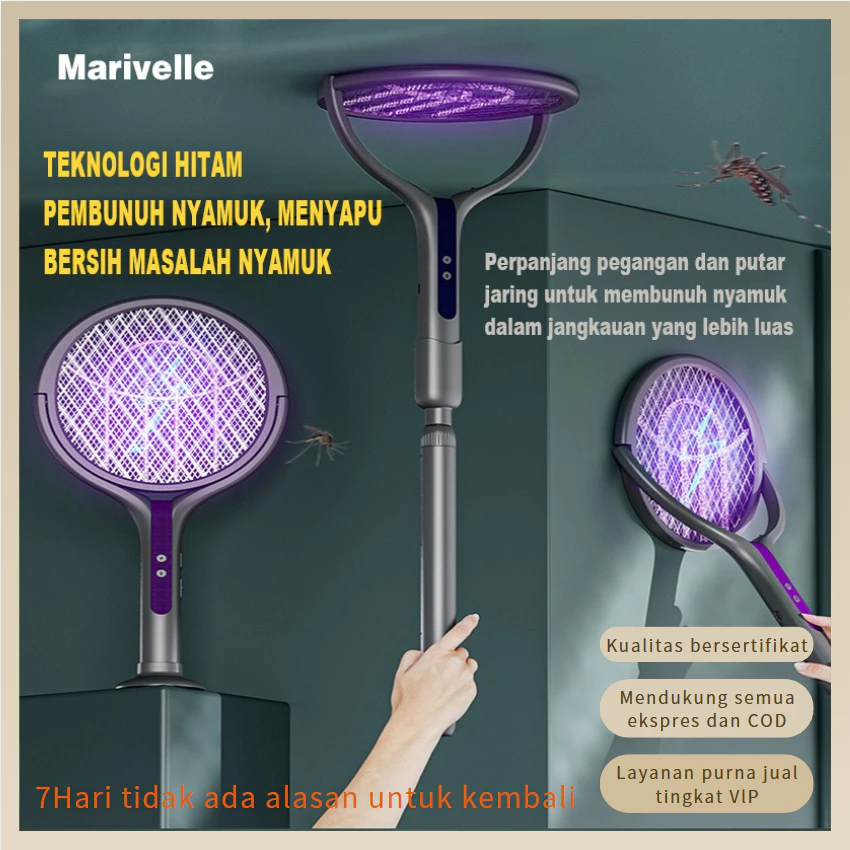 Marivelle Raket Nyamuk hadir dengan desain unik dan praktis, dilengkapi pegangan panjang serta jaring yang bisa diputar hingga 90° untuk menjangkau sudut-sudut sulit. Fitur ini memudahkan Anda membasmi nyamuk yang bersembunyi di dinding maupun area sempit.