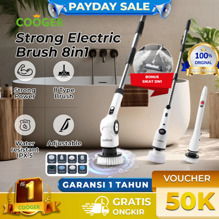 Bersihkan rumah lebih mudah tanpa tenaga ekstra dengan COOGER Sikat Pembersih Elektrik 8in1. Dilengkapi dengan 8 kepala sikat serbaguna dan batang teleskopik adjustable hingga 100 cm, alat ini dirancang untuk menjangkau area sulit sekalipun. Dengan teknologi putar elektrik hingga 420 rpm, noda membandel bisa hilang hanya dengan sekali gosok.